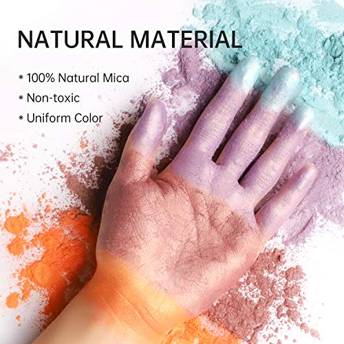 🖌 GEMAKKELIJK TE GEBRUIKEN: De mica-poederkleurstoffen zijn extreem kleurvast en stabiel en kunnen gemakkelijk in alle systemen op waterbasis worden verwerkt, waardoor ze glanzen en twinkelen aan de kunstwerken. Voeg gewoon het poeder toe aan het project en varieer de hoeveelheid afhankelijk van hoe diep de kleur gewenst is. Zorg ervoor dat je grondig roert om klonten te voorkomen bij het toevoegen van de kleurstoffen.